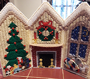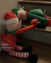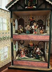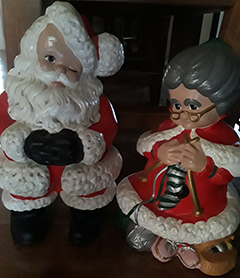 I made this plastic canvas triptych many years ago.This house features animated characters that are activated via wind-up in the back (rather than batteries).The elves on the stairs are generally posed as drunk or hungover.The ceramic Mr. and Mrs. Claus are very special. My mother made them long ago.