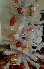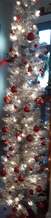 We have a total of 17 decorated trees ranging in all sizes and shapes, including ceramic, pine needle in burlap, Victorian gold and red, silver with red, metal with lights (outdoor), tabletop sizes, a food-only tree, and wall décor that we put bulbs on (my definition is: has branches and we hang ornaments on them, so I count those too).